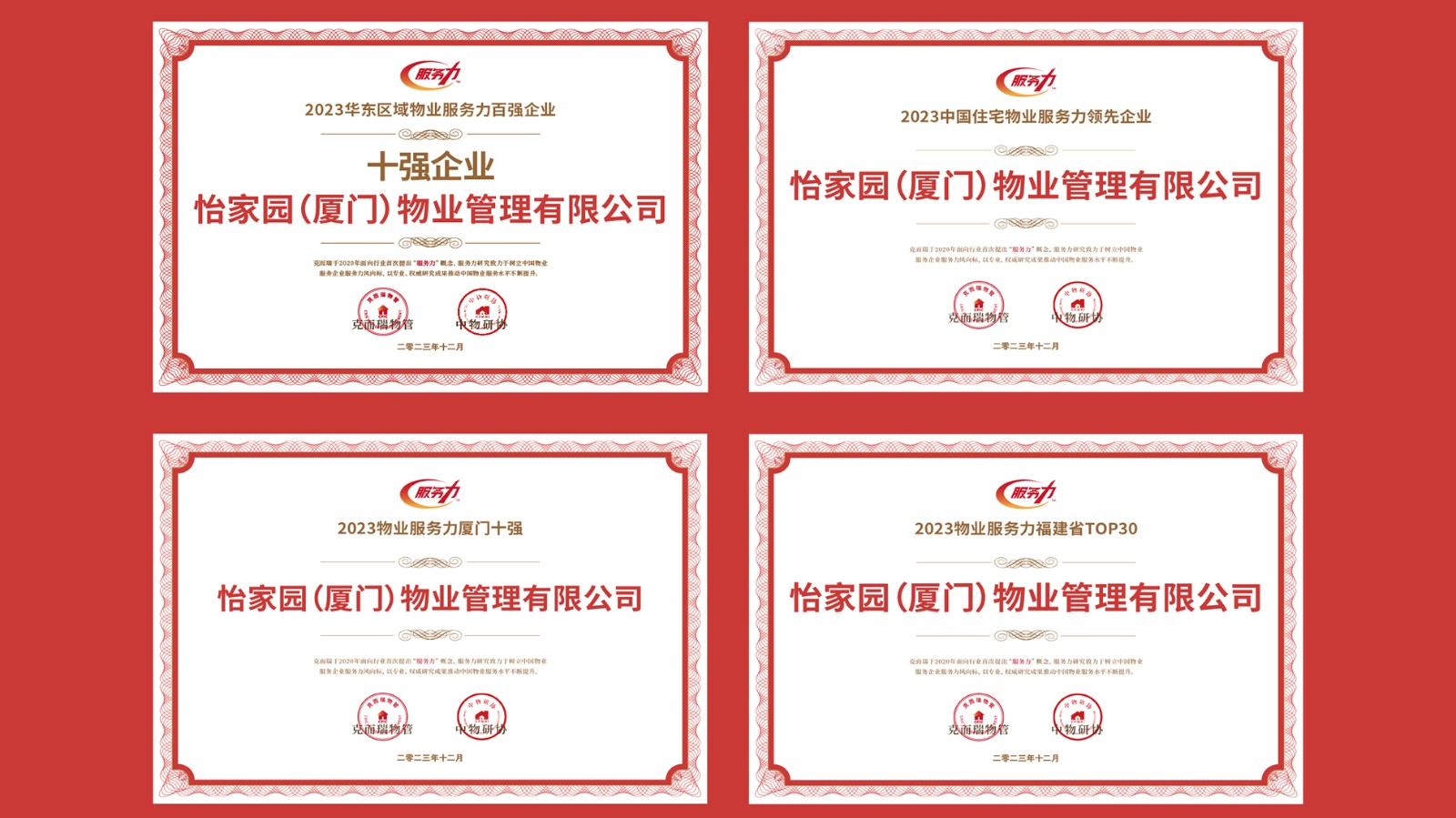 近日,在由克而瑞物管、中物研協主辦的“2023華東區域品牌戰略創新年會”上,建發物業旗下怡家園(廈門)物業管理公司獲“2023華東區域物業服務力百強企業第7位”“2023物業服務力福建省第1位”“2023中國住宅物業服務力領先企業第1位”“2023物業服務力廈門十強第1位”多項榮譽。廈門聯發(集團)物業服務公司則位列“2023物業服務力廈門十強”第2位。