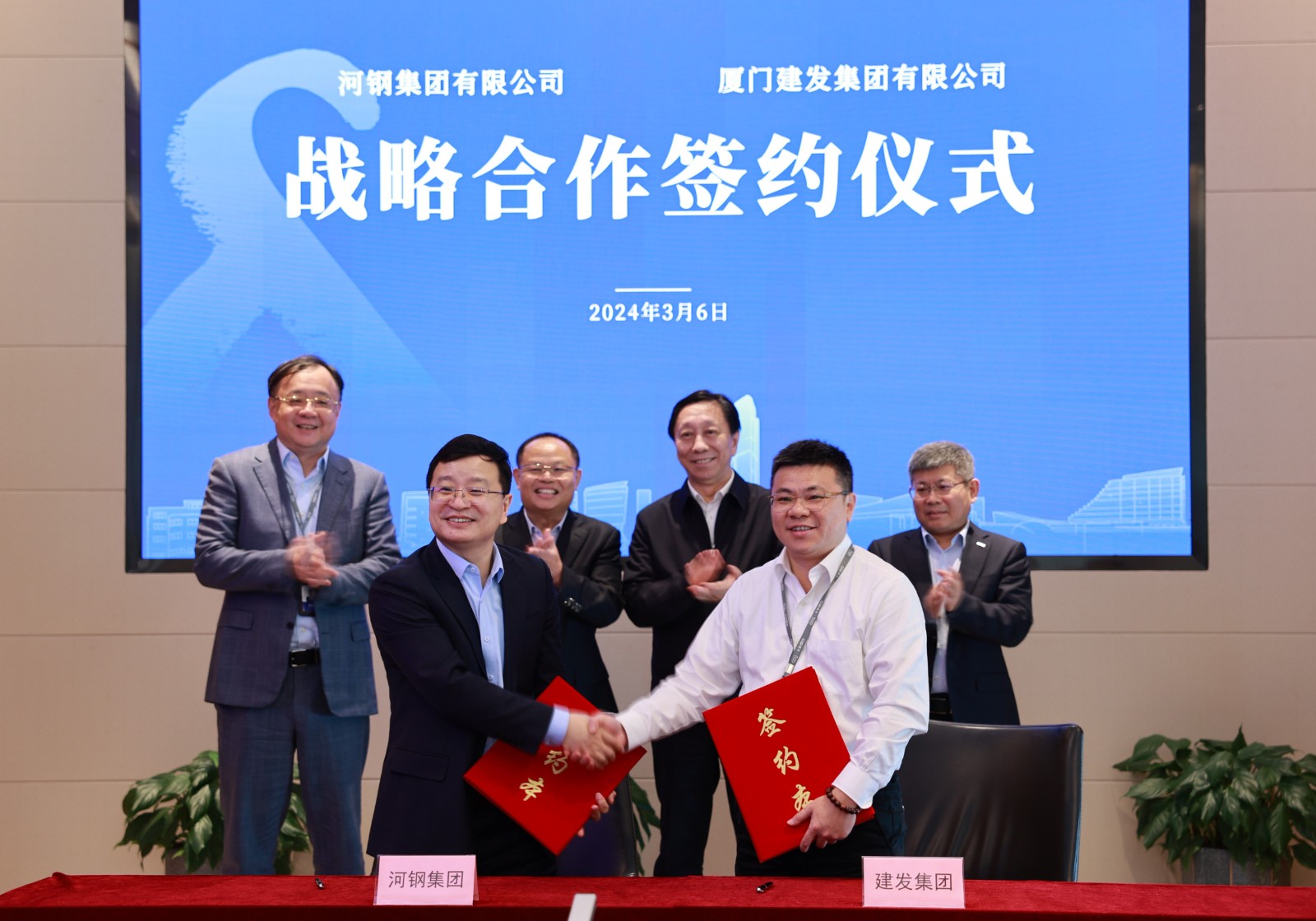 3月6日,建發集團與河鋼集團在廈門簽署全產業鏈戰略合作框架協議。河鋼集團黨委書記、董事長于勇,總會計師、首席財務官胡志剛,建發集團黨委書記、董事長黃文洲,黨委副書記、總經理鄭永達見證簽約,河鋼集團副總經理、首席戰略官李毅仁與建發股份副總經理、鋼鐵集團總經理程東方代表雙方簽署協議。